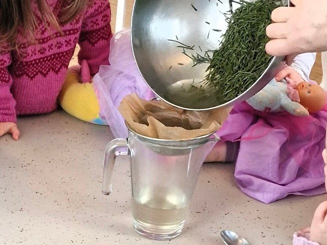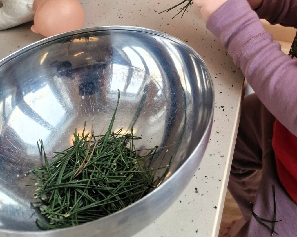 Vargtassene jobber med skinnvotten som tema i januar, og ett av dyrene som er med i eventyret er haren. Haren spiser furunåler om vinteren, så vi tenkte vi kunne prøve å lage te av furunåler. Vi samlet furunåler i barnehagen som vi laget te av. Barna plukket og renset barnålene fra kvister og klippet dem opp. Vi knuste barnålene og helte varmt vann over, deretter lot vi det trekke i minst en halv time. Deretter silte vi brygget gjennom et kaffefilter. De fleste av barna syntes det var kjempegodt, og så var det noen som syntes det ikke var så godt. Det var en gøy og spennende prosess.